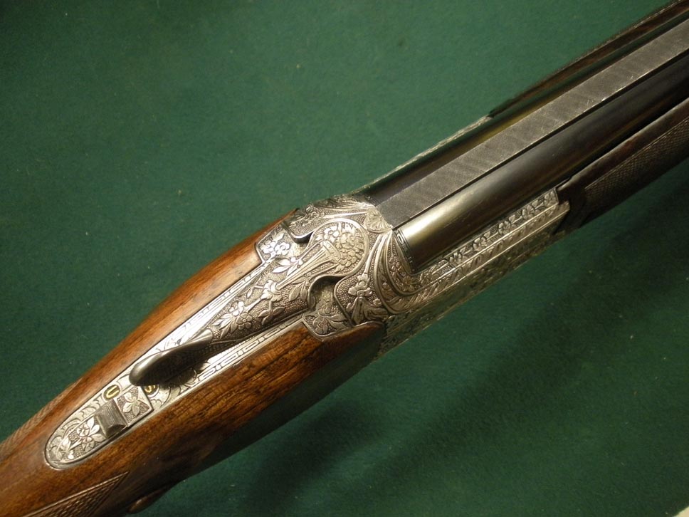 Questo fucile ci è stato sottoposto dal Dr. Paolo Silvano dell’armeria Berrone di Alessandria, cultore e conoscitore di belle armi che riesce a scovare nei luoghi più impensati. La breve storia del sovrapposto in esame verte in particolare sulla sua incisione realizzata dal Capo incisore aziendale dell’epoca, il Maestro André Watrin la cui firma si legge nel minimo cartiglio posto sul bordo inferiore sinistro della bascula. L’allestimento segue le richieste specifiche dell’augusto committente, il re Hassan II del Marocco, con temi non molto consoni al nostro gusto, ma eseguiti con una tecnica e una precisione degni di chi allora dirigeva una delle scuole specifiche più accreditate al mondo. Curioso il motivo dell’esistenza di questo pezzo: dopo aver terminato il primo, quello già prenotato dal monarca, il Maestro decide di proseguire il lavoro realizzando un secondo esemplare uguale al primo.