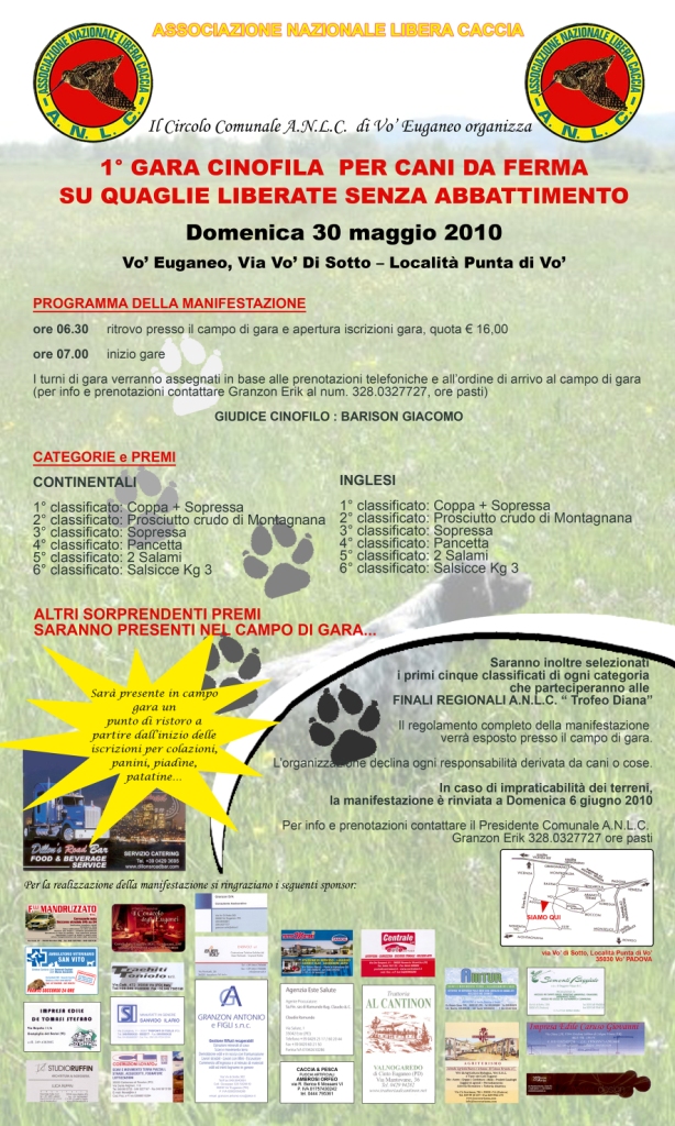 CANI DA CACCIA: L’A.N.L.C. Sez. comunale di Vò Euganeo (PD) organizza la 1° Gara Cinofila per Cani da Ferma su Quaglie Liberate senza Abbattimento per il 30 maggio 2010.