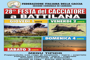 A Battilana di Carrara, dal 1° al 4 agosto compresi, organizzata dalla sezione comunale della Federazione Italiana della Caccia si terrà la ventottesima edizione della Festa del Cacciatore. Un’occasione bella e ghiotta per passare una giornata all’insegna della caccia. Ghiotta per il prelibato menù a base di cacciagione…. e non è cosa da è poco, con cinghiale lepre e capriolo a farla da padrone.