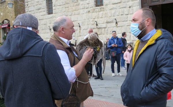 Falchi in volo sul centro storico di Montepulciano. Velocissimi e incredibilmente precisi nelle traiettorie, i rapaci – due della varietà Sacra e un Falco Pellegrino – sono stati liberati da un falconiere professionista. Committente dell’incarico il Comune, che ha avviato una sperimentazione per valutare l’efficacia di questo predatore sulla popolazione di piccioni che purtroppo alberga nei centri storici, arrecando evidenti danni al decoro urbano, all’ambiente, agli stessi beni architettonici.