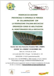 Il corso, il quale è condotto dal dottor Paolo Pennacchini (Presidente di FIBEC e FANBPO), si svolgerà presso la sede della Federcaccia di Perugia e si articolerà in due giornate, per la precisione giovedì 28 e venerdì 29 novembre, dalle ore 17 alle 22.