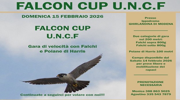 L’Unione Nazionale Cacciatori Falconieri – settoriale della Federazione Italiana della Caccia – organizza il prossimo 15 febbraio presso l’ippodromo Ghirlandina di Modena la Falcon Cup UNCF, gara di velocità con falchi e poiane di Harris. Per la prenotazione e ulteriori informazioni questi sono i contatti: Monica 3888635025 – Agostino 3355437879.