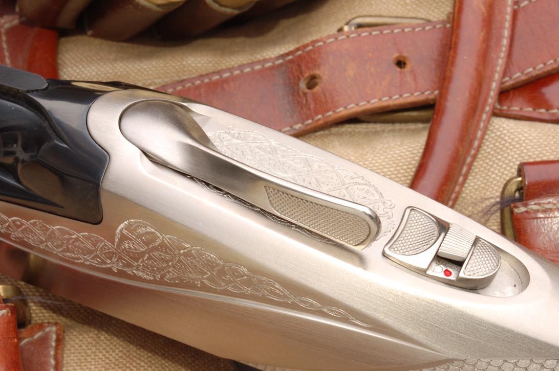 E’ fuor di dubbio che l’osservazione di una tale novità comporti un parallelo con le fatture classiche e proprio la bascula crea quella immediata dissonanza nella mente dove stazionano quali parametri le linee di Boss, Merkel, Browning, Beretta: quando una diversità ha il fine di stupire si va poco lontano, ma se la diversità possiede un carattere dove siano sommati gli elementi estetici e di funzione la strada percorribile sarà molto lunga. Caliamoci idealmente in questa sostanza dove la tecnologia Benelli ha posto al centro il sistema di vincolo e chiusura delle canne mutuato dallo Jäger, ma con migliorie che ne hanno consentito uno specifico brevetto, dotato quindi del blocchetto a L pivotante che funge con la parte longitudinale da aggancio e con quella verticale da chiusura al vivo di culatta delle canne stesse: un pezzo in acciaio duro, sagomato e incastrato tra fondo e fianchi, lo mantiene stabilmente in posizione. Due cilindretti fuoriescono dalla parete verticale fissa inserendosi in appositi recessi ricavati nel vivo di culatta del monobloc.