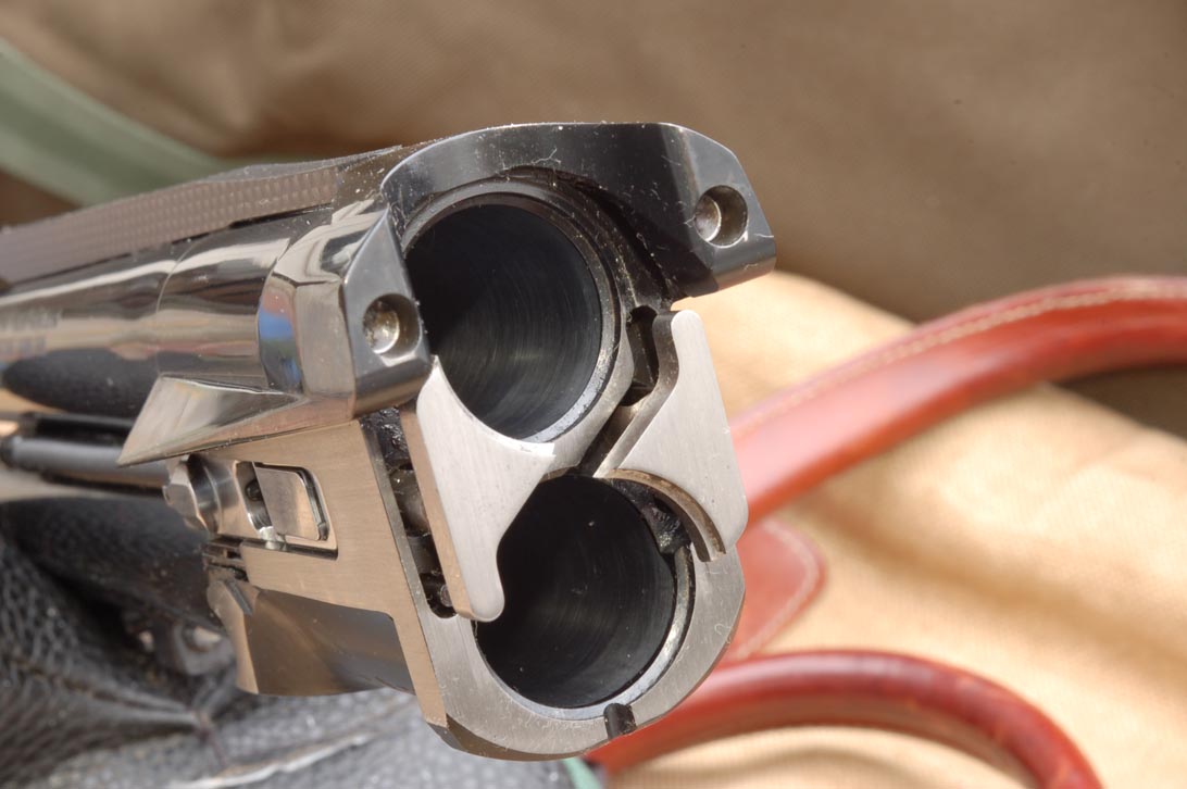 La proiezione in avanti delle canne viene quindi contrastata dall’aggancio inferiore a semianello sgravando i semiperni che sono due particolari, ancora in metallo duro, riportati entro le pareti di bascula. Lo scostamento del vivo di culatta dalla piastra di chiusura è impedito dai due archi di cerchio del rilievo superiore posti a incastro nel bordo dell’estensione di culatta del monobloc; i due cilindretti poi contrastano la rotazione. L’idea diversa è stata innanzitutto di racchiudere in un guscio in lega leggera dall’elegante e inedita forma il cuore del sovrapposto insieme a tutti i particolari che nella concezione tradizionale si legano fra loro con le appendici delle due codette di bascula e della parte del calcio ad esse sottesa: vediamo quindi la chiave di apertura dal profilo arcuato che nel suo movimento arma anche le batterie, nascoste internamente con i percussori e il gruppo di scatto, mentre nella zona superiore risalta il tasto della sicura con il selettore di sparo. Nella parte anteriore di questa innovativa entità sono ricavati i semiperni su cui, tramite i relativi orecchioni, si incavalca il gruppo canne giuntate con il  monobloc di culatta: in questo sono inseriti i gambi degli estrattori comandati da proprie molle per attivare l’estrazione primaria mentre due aste con lunghe molle coassiali poste lungo le canne danno impulso agli eiettori automatici: lo sgancio avviene tramite due denti pivotanti mossi dalla pressione dei gas prelevati da due minuscoli fori nelle canne.