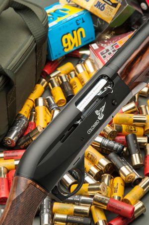 Benelli Colombo. Il fucile specifico: Benelli ha impostato un suo modello adottando gli accorgimenti funzionali alla bisogna: si chiama, tanto per esser chiari, Colombo e promana dalla fortunata serie Montefeltro, quella forse un po’ più defilata nel panorama aziendale dove svetta l’eleganza del Raffaello, ma dotata di prerogative tecniche assai funzionali a principiare dal castello chiuso, ricavato da un estruso di Ergal, entro cui lavora il classico otturatore inerziale. Già da molti anni questa formula mantiene una costante percentuale di vendite poiché molti cacciatori danno la preferenza a tale impostazione tecnica; è quasi consequenziale poi che diversi allestimenti per caccie specifiche si siano sviluppati sul Montefeltro e, da ultima, anche la versione Colombo.