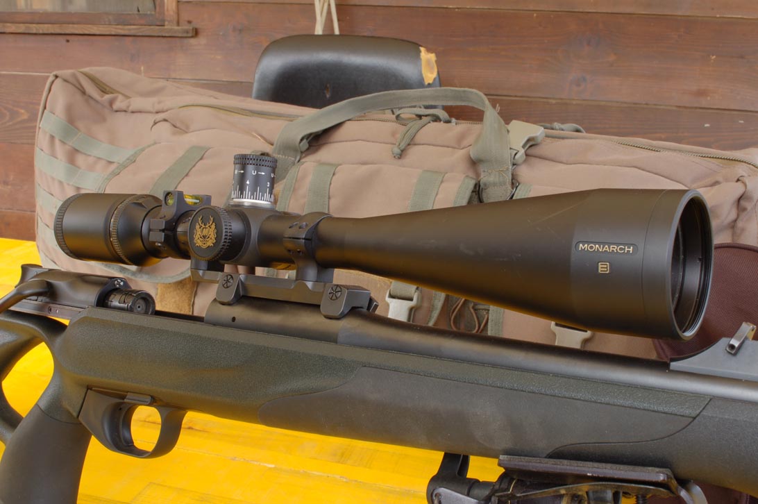 Grazie all’attacco a sella peculiare della Blaser abbiamo potuto provare con speditezza e puntualità tre ottiche Nikon, importate dalla Nital di Moncalieri (TO): la Monarch 7 – 1-4×24, la Monarch 7 IL – 3-12×56 e la Monarch 3 – 6-24×50 SF: c’è tutto quindi dalla caccia in battuta a quella alla cerca a selvaggina varia su diversi terreni a quella decisamente specifica del varmint, per quanto praticabile da noi, al tiro di poligono. In aggiunta alle qualità intrinseche di questi cannocchiali dall’eccellente impianto ottico con reticolo inciso sulla lente e struttura monopezzo con tubo da 30 mm, c’è da osservare un’integrazione apportata dalla Castor, l’azienda creata da Remo Orologio e dal socio Alessandro Castellanelli, sotto forma di torrette balistiche ideate appositamente per le ottiche della marca nipponica, utili anzi necessarie per conseguire certi risultati che Remo mostra nel suo palmares di tiro agonistico. Nel compatto 1-4×24 spicca la pupilla di uscita di ben 16 mm, la distanza oculare di 96,5-94,0 mm e il campo visivo a 100 m di 39,9 m con 1x, tutti fattori utili a una pronta assunzione dell’immagine e un veloce intervento di tiro. Nel 3-12×56 spiccano il diametro dell’obiettivo finalizzato alla massima luminosità e definizione dell’immagine anche in scarse condizioni di luce, quindi ottimale per la caccia ai selvatici crepuscolari, abbinata alla gamma di ingrandimenti valida per tiro in movimento come per l’aspetto anche a distanze considerevoli: è presente la correzione della parallasse sulla torretta laterale e l’illuminazione del reticolo. Il 6-24×50 si caratterizza per il tubo da 1” (25,4 mm), pupilla di uscita di 2,1 mm che impone un accurato posizionamento dell’occhio, reticolo posto sul secondo piano di immagine così da non mutarne lo spessore apparente variando gli ingrandimenti: il reticolo Duplex (fine crosshair) consente una mira molto accurata così come la taratura degli scatti delle torrette impostati a 1/8 di MOA. Non manca certo la terza torretta per il correttore della parallasse.