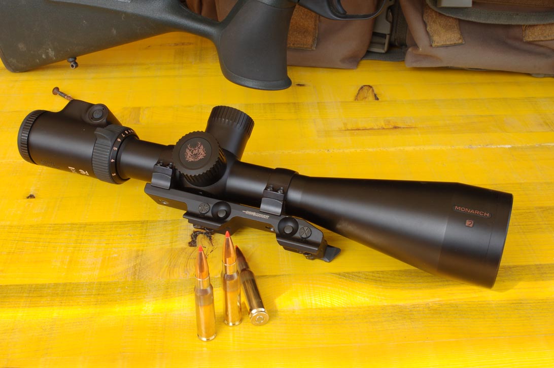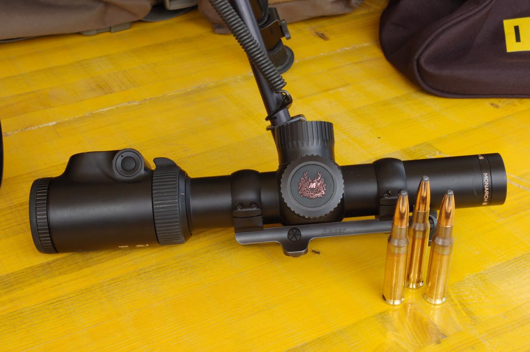 Grazie all’attacco a sella peculiare della Blaser abbiamo potuto provare con speditezza e puntualità tre ottiche Nikon, importate dalla Nital di Moncalieri (TO): la Monarch 7 – 1-4×24, la Monarch 7 IL – 3-12×56 e la Monarch 3 – 6-24×50 SF: c’è tutto quindi dalla caccia in battuta a quella alla cerca a selvaggina varia su diversi terreni a quella decisamente specifica del varmint, per quanto praticabile da noi, al tiro di poligono. In aggiunta alle qualità intrinseche di questi cannocchiali dall’eccellente impianto ottico con reticolo inciso sulla lente e struttura monopezzo con tubo da 30 mm, c’è da osservare un’integrazione apportata dalla Castor, l’azienda creata da Remo Orologio e dal socio Alessandro Castellanelli, sotto forma di torrette balistiche ideate appositamente per le ottiche della marca nipponica, utili anzi necessarie per conseguire certi risultati che Remo mostra nel suo palmares di tiro agonistico. Nel compatto 1-4×24 spicca la pupilla di uscita di ben 16 mm, la distanza oculare di 96,5-94,0 mm e il campo visivo a 100 m di 39,9 m con 1x, tutti fattori utili a una pronta assunzione dell’immagine e un veloce intervento di tiro. Nel 3-12×56 spiccano il diametro dell’obiettivo finalizzato alla massima luminosità e definizione dell’immagine anche in scarse condizioni di luce, quindi ottimale per la caccia ai selvatici crepuscolari, abbinata alla gamma di ingrandimenti valida per tiro in movimento come per l’aspetto anche a distanze considerevoli: è presente la correzione della parallasse sulla torretta laterale e l’illuminazione del reticolo. Il 6-24×50 si caratterizza per il tubo da 1” (25,4 mm), pupilla di uscita di 2,1 mm che impone un accurato posizionamento dell’occhio, reticolo posto sul secondo piano di immagine così da non mutarne lo spessore apparente variando gli ingrandimenti: il reticolo Duplex (fine crosshair) consente una mira molto accurata così come la taratura degli scatti delle torrette impostati a 1/8 di MOA. Non manca certo la terza torretta per il correttore della parallasse.