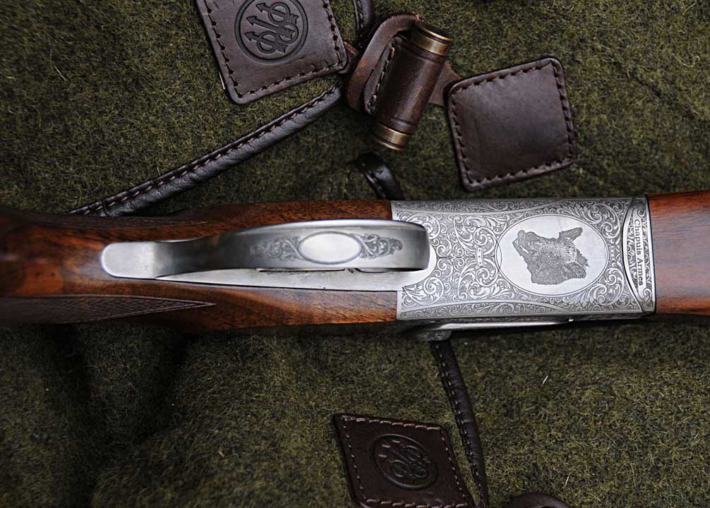 La bascula molto elegante e incisa con motivi floreale è rinforzata con i classici “baffi” che la irrobustiscono e ne alleggeriscono la forma, l’incasso con il calcio è particolarmente accurato e aggraziato dal disegno ondeggiante della bascula. I seni non sono molto accentuati e sono appiattiti nella zona superiore così da non intralciare la visuale del bersaglio. All’interno della bascula c’è il particolare sistema di chiusura sviluppato da Chapuis negli anni ’70, caratterizzata da un tassello di ben 22 mm posizionato nel punto più basso della bascula che infierisce sotto le canne e dai perni per la rotazione e l’apertura dell’arma. È lo stesso sistema utilizzato anche sugli express “Africani” calibro 416 Rigby e 470 NE. Notiamo anche la possibilità di smontare i percussori agendo sui grani dove sono alloggiati. La batteria è di tipo box look e l’express può avere il classico doppio grilletto o il monogrillo per chi preferisce questa soluzione. Nella parte superiore troviamo la chiave di apertura, ben proporzionata e comoda da azionare e il tasto della sicura, scorrevole come su tutte le doppiette classiche.
