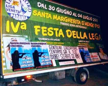 Caccia – Doppio blitz anti-caccia degli animalisti: nel mirino dei militanti Berlato e Gentilini. Tappezzata di striscioni la sede dell’associazione a Mestre e il cartellone della “Festa della Lega” tra Este e Monselice.