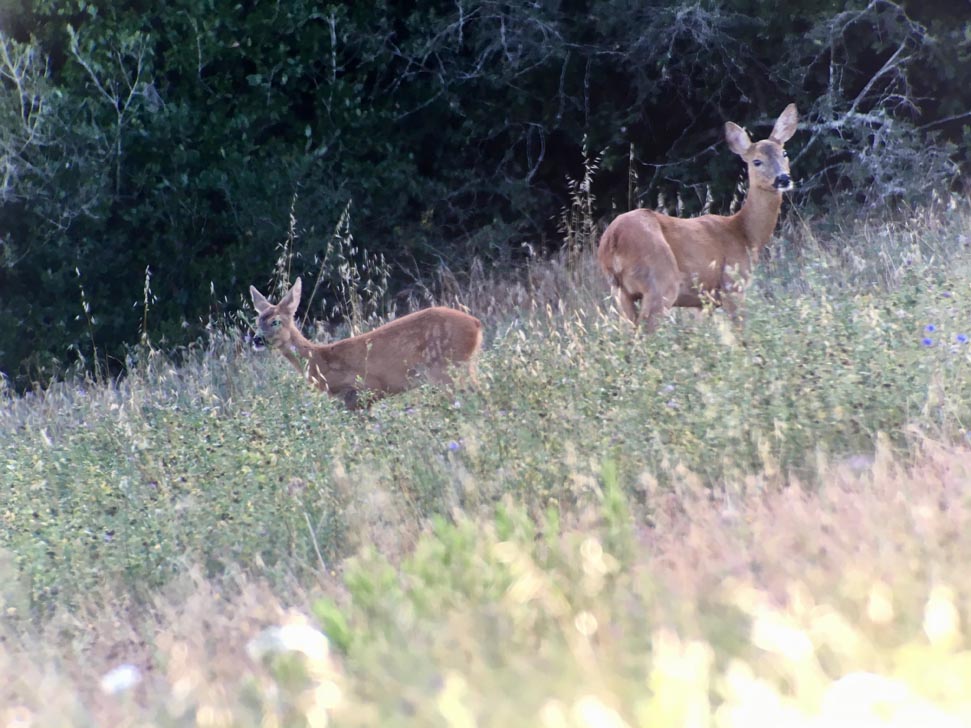 A occhio nudo la mia attenzione è catturata dalle nere sagome di due cinghiali che sbucano dal bosco nel poggio in alto. Subito sopra, a pochi metri da loro, scorgo fugacemente un capriolo, che a prima vista sembrava essere un maschio, ma non mi da il tempo di approfondire la conoscenza. Ai due cinghiali si aggiunge un terzo, seguito da diversi piccoli. Sarei tentato di provare ad avvicinare il capriolo lassù ma la presenza dei cinghiali nei paraggi e il vento impercettibile ma sfavorevole, mi fanno desistere. Aspetterò, sperando che il capriolo si avvicini. Continuo a sbinocolare a 360 gradi ma il mio sguardo è sempre attratto dal punto in cui ho visto il capriolo. La luce comincia a scemare, sono le 21.10. “Eccolo!” Pina ha visto il giovane maschio, che nel frattempo ha guadagnato il campo che presiedo. Lo controllo bene nell’ottica: è il capo che cercavo!