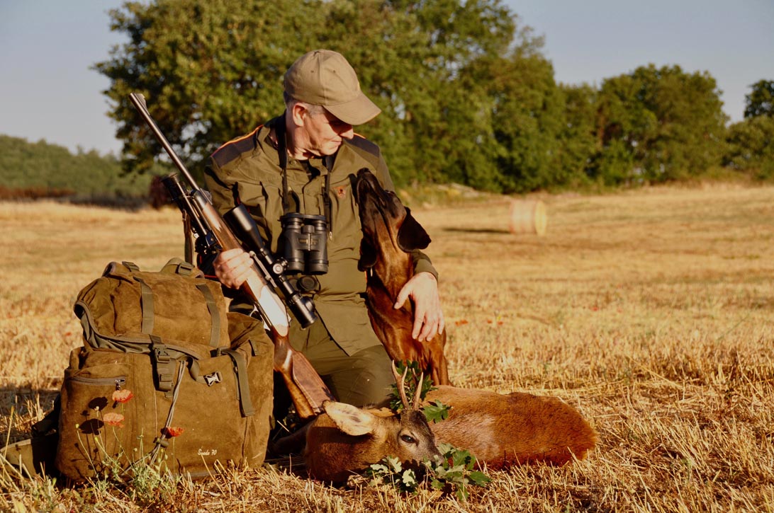 I primi raggi del sole di giugno fendono le colline e si lanciano come dardi sui campi. Uno di essi va a scaldare il pelo rosso di una mamma volpe che con premura e meticolosità affonda il muso nel morbido pelo piumato del suo piccolo per liberarlo dagli insetti. La scena ci cattura, per un attimo ci fa dimenticare il nostro ruolo di “predatori” e ci restituisce con gli interessi la fatica della sveglia a poche ore dalla cena. Decidiamo di lasciare l’appostamento temporaneo per approdare ad un punto di osservazione più favorevole, protetti dagli ultimi zaffi di foschia. Ad ogni passo sbinocoliamo. All’unisono, ci accovacciamo quando il rosso del folletto incrocia i nostri binocoli. Il suo portamento, la stazza e l’assenza di un poderoso palco lo fanno sembrare un maschio giovane. Dalle lenti del lungo confermo a Paolo che si tratta di un M1. Paolo si allunga a guardare nel lungo e conferma immediatamente che per lui il capo è perfetto. Il giovane capriolo non è fermo nel campo, ma pilucca l’erba e nel mentre cammina, senza mai, di fatto, fermarsi. Da dove siamo noi non è il caso di sparare, la sagoma non è del tutto visibile. Decidiamo di spostarci un po’ più in cima sul poggetto, in modo da aumentare la prospettiva.