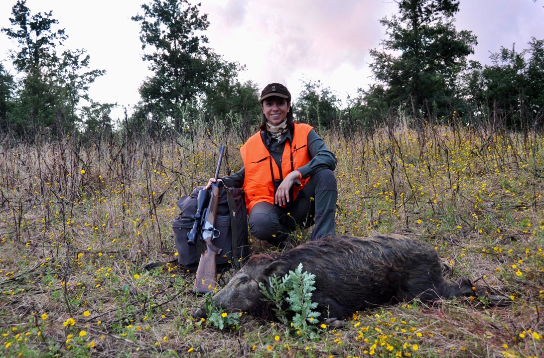 Fiduciosa aspetto, sbinocolando a 360 gradi ma con particolare attenzione verso la macchia che ha inghiottito il branco dei sogni… Una capriola sbuca dall’angolo più recondito che si vede da qui, cammina circospetta e quasi senza brucare. “Forse va dal piccolo che ha lasciato in questo pratone” bisbiglio a Vincenzo. Sempre guardinga scompare dopo pochi minuti, anche lei tornerà? Chissà…. “Che ti dicevo?!” esclama soddisfatto Vincenzo, mentre il suo binocolo punta sul limite della macchia. Una scrofa, dopo aver messo il grifo fuori per un po’, ha deciso che è ora di concludere il pasto interrotto poco prima. Con un balzo guadagna il prato, dove l’erba particolarmente bassa permette di valutare bene le sue forme e soprattutto di vedere interamente i numerosi striati che la seguono. Niente da fare. Anche se la legge me lo permette, non sparerei mai alla scrofa con i piccoli. Lascio cadere il binocolo sul petto e posiziono la carabina sul treppiedi per godermi la scena a maggiore ingrandimento. “E’ tutta una matassa di cinghiali!” sussurro a Vincenzo. Potrei provare a prendere un piccolo ma l’idea mi appare presto alquanto malsana: a 160 metri uno striato non è un bersaglio facile. I piccoli non stanno fermi un attimo e poi son sempre attaccati tra loro, con il rischio di ferirne più di uno con un colpo, non sarebbe un tiro etico….Passano i minuti, il mirino è fermo sulla scrofa, ma il cane dell’R8 è disarmato. Dalla macchia arrivano altre due scrofe, una è più piccola, non si vedono le mammelle…”Ecco…questa va bene!” penso. Ora non resta che mantenere la calma e….Aspetto che il capo prescelto si discosti il giusto dal resto del branco. Tutto ciò richiede qualche minuto. Sembrano attimi eterni. Ora il mio bersaglio è a cartolina e non ha intorno altri animali. Finalmente l’indice dà il suo assenso e, prima ancora di decidere di tirare, la palla da 7 mm è già alla base del collo del cinghiale, che si accascia sulle quattro zampe senza emettere un gemito. Gli altri elementi del branco restano interdetti per un attimo, finché la scrofa adulta dà il via per un’uscita di scena che, a questo punto, per stasera sarà definitiva.