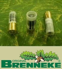 La ditta Brenneke ha messo in commercio la cartuccia RubinSabot, con una palla con impennatura in plastica dal peso di 28 gr. ed in grado di raggiungere la velocità iniziale di 510 ms (J. 3641), scendendo a 410 ms a 50 metri (J. 2285) ed a 334 ms a 100 metri (J. 1562). Innovativa risulta la palla SuperSabot, la quale comporta però il fatto che deve essere sparata da canne rigate per essere stabilizzata, poiché priva di impennatura. Questa palla pesa 31,8 gr e raggiunge la velocità ed energia di 465 ms e 3438 J. alla bocca, 374 ms e 2220 j. a 50 m. e 317 ms e 1598 J. a 100 metri. Ha un diametro di 16 mm. ed è composta all’esterno da una lega di ottone con un nocciolo composito, la quale si va a deformarsi a forma di fungo nel momento in cui impatta. La rosata di 5 colpi a 100 metri è risultata inferiore a 7 cm di diametro.