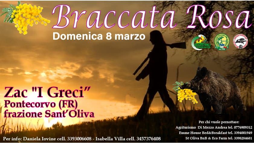 La Braccata si svolgerà nella ZAC “I Greci” di Pontecorvo (provincia di Frosinone), inoltre saranno a disposizione delle partecipanti 20 poste. Per le canaie ci sarà la possibilità di sciogliere i loro cani. A seguire, nella stessa tenuta, è previsto un bel ritrovo a pranzo per festeggiare, un’occasione da non lasciarsi sfuggire.