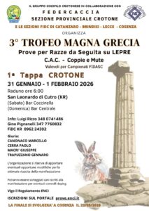 Il Gruppo Cinofilo Crotonese, in collaborazione con la Federcaccia Provinciale di Crotone e le sezioni Federcaccia di Catanzaro, Brindisi, Lecce e Cosenza, ha organizzato il 3° Trofeo Magna Grecia, Prove per Razze da Seguita su Lepre C.A.C. – Copie e Mute.