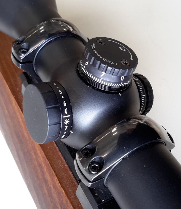 I reticoli di tipo 4A-I, sul secondo piano focale, grazie al tubo da 30 mm hanno un’ampia escursione di regolazione in alzo e deriva, inoltre sono dotati di un dot illuminabile piccolo e definito. La terza torretta infatti consente la regolazione degli 11 livelli di luminosità del reticolo, 5 in modalità notturna e 6 in diurna oltre a una posizione OFF tra una fase e l’altra. Il vano batterie è integrato nella torretta.