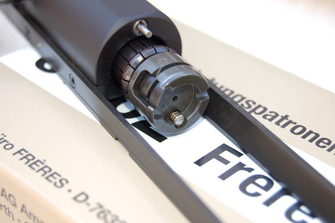 Da rilevare per prima cosa come la giunzione fra canna e otturatore sia diretta con la canna fissata tramite due pilierini solidali alla camera di cartuccia e filettati internamente in cui due brugole si avvitano dopo aver attraversato la calciatura davanti alla guardia. La canna viene ricavata per rotomartellatura e finita esternamente con il ribasso conico di 11° del vivo di volata per proteggere l’egresso delle righe e minimizzare l’effetto del soffio di bocca sulla palla, mentre all’interno della culatta un anello a ribasso rappresenta il punto di aggancio per il sistema di chiusura. Il complesso dell’otturatore vede un supporto inferiore con due guide di scorrimento inserite nell’apposita sede del fusto, il carrello a movimento solo lineare, la testina di bloccaggio, la carenatura esterna dove, sul fianco destro è inserito il manubrio e posteriormente sporge il tasto di armamento della batteria. La parte anteriore dell’otturatore vede la testina cilindrica a faccia ribassata con una sostanziosa fresatura in cui scorre ortogonalmente il blocchetto dell’estrattore, tenuto a registro da una molla a filo: una soluzione robusta e funzionale affiancata dal nottolino elastico di espulsione. Dietro alla testina si trova un cilindro di acciaio armonico intagliato per i 4/5 della propria lunghezza così da ricavare dodici lamelle elastiche, unite nella base comune del cilindro e terminanti ognuna con un dente a profilo lievemente inclinato. Osserviamo ora il manubrio, imperniato nel fianco e dotato di moto pendolare, grazie a cui si garantisce l’avanzamento e il fermo in chiusura dell’insieme posteriore: il movimento spinge entro le lamelle un puntone che, grazie al profilo conico, le mette in espansione vincolando i denti entro l’incavo a corona circolare fresato nella culatta della canna. Notevole la superficie totale di contrasto e inoltre il riarmo risulta assai veloce, spostando minimamente l’arma dalla linea di mira. Questo vincolo fra l’otturatore e la canna lascia al castello ben pochi sforzi da compiere così che viene realizzato in ergal per una maggiore leggerezza. Da aggiungere inoltre che una levetta consente il facile svincolo della testina così come le due viti a brugola l’asportazione della canna: entro gruppi omogenei di cartucce è quindi sostituibile il calibro con vantaggi intuibili soprattutto per i viaggi venatori.