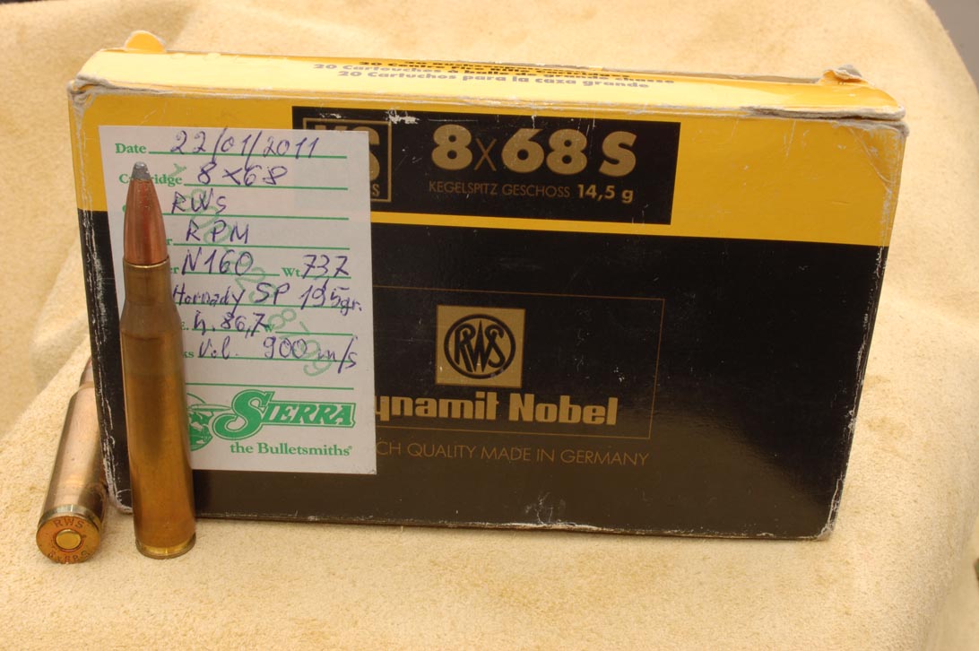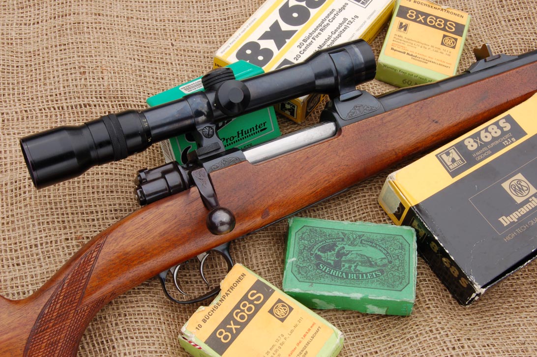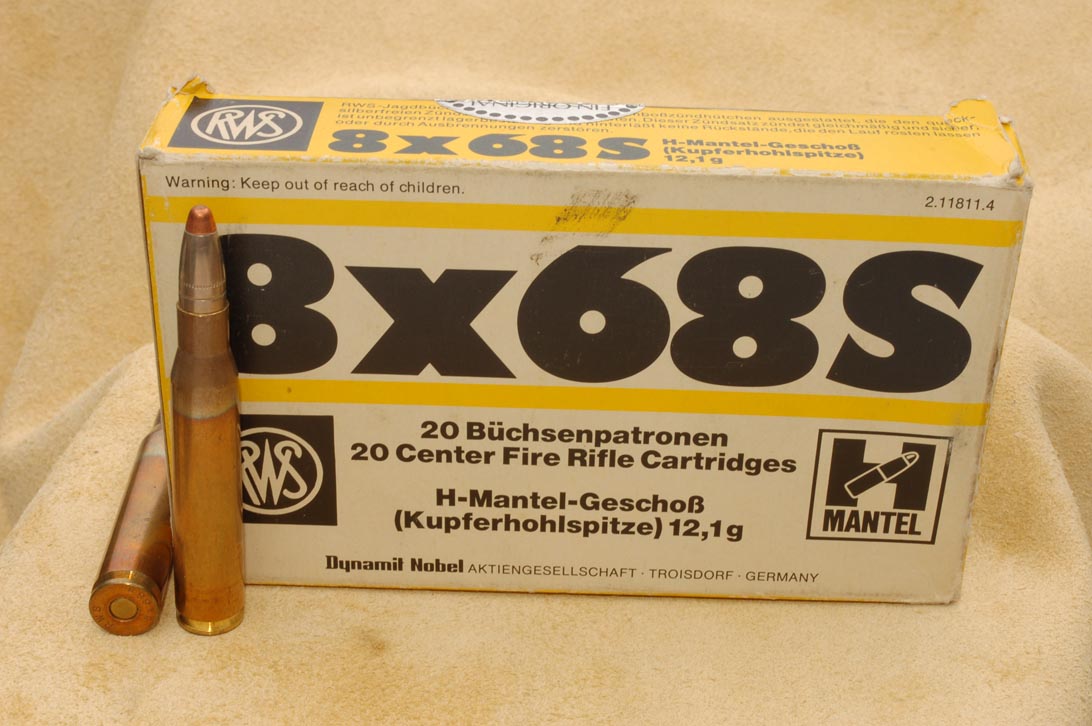 Nata ufficialmente nel 1940 con gli studi del tecnico Otto Schuler la cartuccia 8x68S viene allestita con lo scopo precipuo della caccia al cervo nelle foreste tedesche, nelle pianure danubiane, nei boschi e nei monti dei Carpazi dove esemplari intorno ai trecento kg di peso e dai trofei imponenti illustrano la valentia del cacciatore, delle sue armi e del territorio. Già erano in uso altri 8 mm, la misura ritenuta specifica per il re della foresta, come l’8×57 e l’8×60 di Mauser, insieme al gagliardo 8×64 di Brenneke, tutti proposti in versione normale o S che indica la palla da 8,2 mm anziché quella più vecchia da 8,02 mm. La nuova realizzazione è nata e rimasta solo in versione S, come puntualmente indica il suffisso apposto alle canoniche misure di palla e bossolo. Presto detti i fini del progetto: una cartuccia in grado di spingere proiettili medio pesanti, indicativamente da 11,5 a 14,5 g, a velocità inusuali per l’epoca, quindi in grado di assicurare una elevata tensione di traiettoria e una cospicua riserva di energia anche a distanze considerevoli, all’epoca quantificabili nei 300 m, senza trascurare la debita precisione. Non va dimenticato come nel periodo la Germania fosse ai vertici nella scienza e nella tecnica, ivi comprese le poveri da sparo, quindi l’idea di accelerare una palla da 12,7 g, la misura più caratteristica, poco sotto i 1.000 m/sec si era tramutata in realtà. Se osserviamo il bossolo noteremo alcune differenze dalle ultime realizzazioni attuali e una riconferma: quest’ultima è rappresentata dal corpo liscio, senza cintura, a cui i tedeschi sono sempre stati affezionati, con la sola eccezione del 7×73 Vom Hofe, perché garante di una posizione più precisa grazie allo spazio ben più corto fra la battuta effettuata dalla spalla e la posizione del proiettile rispetto a quello dato dalla battuta sulla cintura.