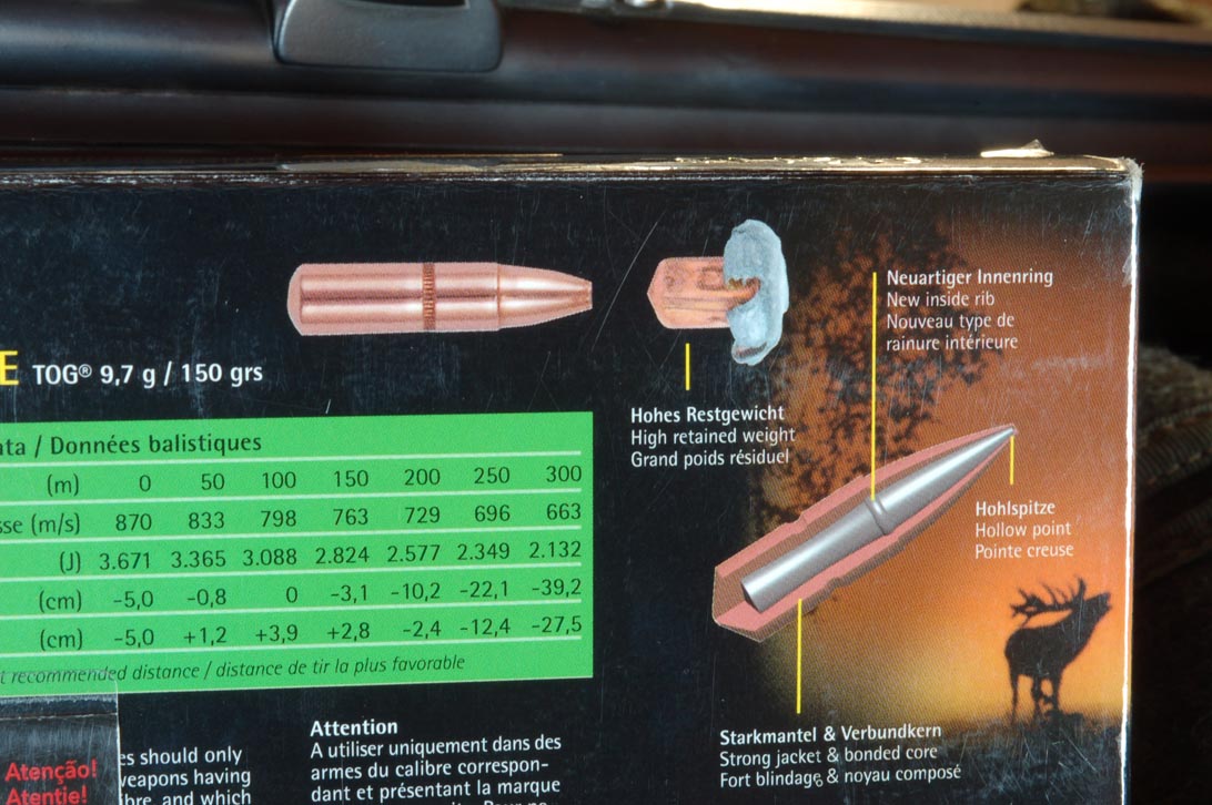 Presentate in una solida scatola di cartoncino le cartucce sono inserite in un alveare fisso, sempre dello stesso materiale: l’aspetto esterno è accattivante e sulla lucida superficie spiccano innanzitutto la sagoma della cartuccia a fianco di quella di un cervo al bramito, sul bordo inferiore il marchio aziendale con le fronde di quercia e le ghiande, la sagoma e il logo della palla TOG, la dicitura completa del calibro, della palla e del suo peso in grammi e grani. Pressoché analoghe le diciture riportate in leggibile e bella grafia, giallo su fondo verde, sui fianchi della confezione mentre, al retro, si nota subito un piccolo pieghevole applicato alla scatola con le scritte in ben ventitré idiomi per cautelare l’utilizzatore dal pericolo di esplosioni; a contorno insieme al cervo e al marchio come già osservati, si notano tre viste della palla TOG, da integra sezionata a un primo urto per passare successivamente all’affungamento, con le descrizioni delle reazioni e della funzione del proiettile a fianco di ognuna. Pratico e interessante lo specchietto balistico dove, insieme ai valori di velocità ed energia alle distanze comprese fra 0 e 300 m, si indica la traiettoria con azzeramento a 100 m e quella, molto funzionale, con la GEE, la taratura alla distanza ottimale per non superare in elevazione i 4 cm: qui il punto è situato a 182 m con una caduta a 300 m di 27,5 cm dove si leggono ancora 2132 joules per questa palla da 9,7 g/150 gr di cui si indica anche il CB (coefficiente balistico) pari a 0,423.
