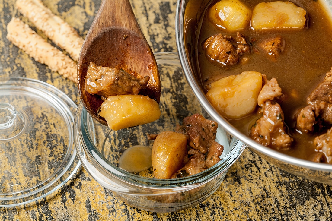 Lasciare scoperto il tegame e mescolare di continuo finché non sarà scomparso l’odore del vino, poi aggiungere la polpa di pomodoro fino a ricoprire completamente la carne. Fare bollire lentamente per 15 minuti poi aggiungere le patate tagliate a tocchetti in quantità pari al peso della carne prima di iniziare a cuocerla. Coprire e continuare a cuocere a fuoco moderato. Quando le patate saranno cotte lo spezzatino sarà pronto per essere servito. Se durante la cottura tenderà ad asciugarsi troppo aggiungere brodo di carne.