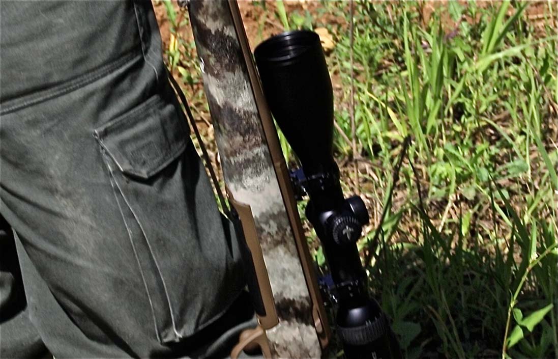 Intanto prepariamo il necessario e il superfluo, ma a cui è bene prestare molta attenzione: ci si augura sempre che basti il primo colpo, ma avere altre cartucce di scorta è doveroso per ogni evenienza. Così infiliamo nella cartucciera alcune cariche sistemandola alla cintura e riempiendo poi il caricatore staccabile, comodo perché si arriva in zona di caccia con tutto pronto e in piena sicurezza: la realizzazione in polimero stampato di questo particolare lo rende leggero e resistente, la forma decisamente arrotondata non si impiglia nella tasca in cui lo si pone, il sistema rotante sfrutta la larghezza così che non sporga dal profilo del fusto. Un ultimo sguardo all’interno della canna e ci avviamo verso il punto designato, al bordo di un’ampia radura, prossimi al bosco che su quel lato la delimita. Lorenzo Verra, titolare della Tenuta Bonicelli, ci ha già fornito il bastone a treppiede estensibile, pratico e comodo per i tiri in piedi: lo metteremo nella giusta configurazione tra non molto. Siamo circa a metà della base ideale di un triangolo posto in marcata pendenza alla nostra sinistra e digradante, fino ad essere in piano, a destra: i lati sono delimitati nel lato alto da bassi arbusti e in quello basso da vegetazione fitta, mista di arbusti e alcune piante d’alto fusto. Nel vertice opposto a noi potrebbe palesarsi la nostra preda sbucando da un leggero rilievo che nasconde alla vista quanto sta dietro: con lo Swarovski EL Range rileviamo le distanze utili che non sono quelle a cui potrebbero accedere il fucile e l’ottica, ma il territorio e la conseguente postura di tiro impongono certe limitazioni e verificheremo come sarà favorevole la gamma di possibilità offerte. Lo sfondo è a 158 m e le due possibili vie che il daino potrà percorrere sono lungo i lati del triangolo: entrambe offrono buone possibilità di tiro con la superiore punteggiata da bassi cespugli mentre in quella inferiore l’erba alta nasconde la prima parte del tragitto, sempre che l’animale scelga di fiancheggiare il corso d’acqua di qua e di non attraversarlo altrimenti saremo di fatto fuori dai giochi. La divergenza dei due percorsi rispetto alla nostra posizione fa sì che la distanza di ingaggio sia quasi costante, con la variazione di qualche diecina di metri nel punto più prossimo della parte bassa e pianeggiante.