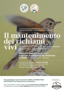 La sezione Comunale Cacciatori Sarnico (FIDC) organizza per giovedì 31 marzo alle ore 20.45 presso l’Auditorium Comunale del Municipio di Sarnico (provincia di Bergamo), una serata formativa gratuita sul tema “Il mantenimento dei richiami vivi- tecniche e accortezze per migliorarne la qualità e il mantenimento”, condotta da Firmo Bazzani.