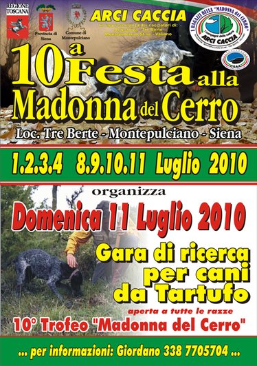L’11 luglio, in località Tre Berte a Montepulciano (SI), si festeggierà la 10ma Festa alla Madonna del Cerro. Arcicaccia con il patrocinio della regione Toscana, la provincia di Siena e il comune di Montepulciano organizza una Gara di ricerca per Cani da tartufo (aperta a tutte le razze).