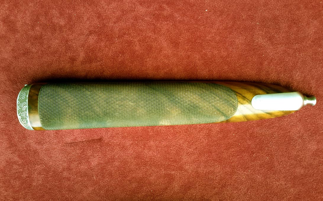 Il sistema di funzionamento della batteria, di tipo interno “Anson”, è caratterizzato dall’utilizzo di molle a lamina molto veloci, classiche dei fucili di pregio. I cani con rimbalzo fanno si che i percussori, anche a fucile scarico, rimangano all’interno del corpo bascula. Il monogrillo selettivo assicura una maggior velocità e stabilità nel tiro del secondo colpo, particolarmente performante nei drive a fagiani e pernici o in tutte le occasioni dove le coppiole sono la regola. Naturalmente, trattandosi di una doppietta, il calcio è all’inglese ed è realizzato con pregiato legno di grado 4 trattato a olio naturale. Il calcio è sprovvisto di calciolo ed è finito con un elegante zigrino realizzato a mano. Un tappo sempre in legno permette l’accesso alla vite di smontaggio. Anche l’asta è dello stesso legno, e il pistone di smontaggio risulta alloggiato in un elegante puntale metallico. Nella zona della croce è accolto il sistema “ecologico”, ossia un selettore che consente di eliminare l’automatismo degli estrattori: un dispositivo particolarmente apprezzato da chi non vuol lasciar cadere i bossoli in terra e predilige invece estrarli manualmente.