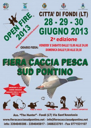 Dopo il grande successo della prima edizione svoltasi lo scorso anno, l’Associazione “The Hunter” organizza l’edizione 2013 di “OPEN FIRE”, la Fiera della Caccia e della Pesca del Sud Pontino; patrocinano l’evento la Regione Lazio, la Provincia di Latina, il Comune di Fondi in collaborazione con altri Enti ed organizzazioni. L’evento nasce dall’idea dell’associazione “The Hunter” di portare nel Sud Pontino un importante evento dedicato a tutti gli appassionati dell’attività venatoria e dell’outdoor; la prima edizione svoltasi lo scorso anno ha riscosso un notevole successo e questa seconda edizione promette un programma ancor più ricco per una fiera che già da subito mostra di possedere le carte giuste per divenire uno dei più importanti appuntamenti del settore in Italia.