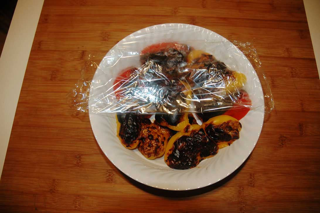 Lavare i peperoni, dividerli a metà, privarli dei semi e grigliarli in forno. Non appena i peperoni saranno sufficientemente cotti metterli in una ciotola, coprirli con della pellicola e farli freddare, questa operazione faciliterà la rimozione della pelle.