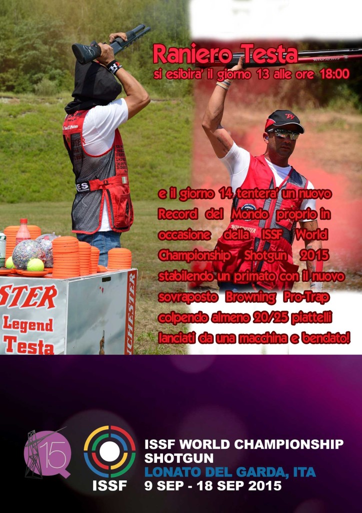 Raniero rappresentando la Winchester-Browning e per la prima volta la FITAV farà uno spettacolo il giorno 13 alle ore 18:00 in stile tricolore sparando con Armi Winchester. Il giorno 14 Raniero con il suo sovrapposto tenterà di certificare una prova record davvero particolare e difficile, colpire in pedana (piattelli lanciati da una macchina) almeno 20 piattelli su 25 completamente bendato. La prova sarà certificata da giudici e dalla presenza del Guinness Word Record. Se Raniero Riuscirà sarà il suo 5 Record certificato. Da poco conferito l’onoreficeza Alfiere dello Sport dal Prefetto della Provincia di Frosinone e quella di Gran Cavaliere della Repubblica per i suo modo di manifestare la passione per il tiro a volo e le armi, per i suoi Record, e l’aver avuto l’onore dalla Winchetser Army un’arma intestata e commercializzata in tutto il mondo,considerando che nella storia solo john Wayne e Buffalo Bill avevano in precedenza ricevuto tale riconoscenza. A settembre-Ottobre Raniero completerà il 2015 con un record in arma rigata e l’altro con il suo SX3 con l’ausilio del suo punto rosso Aimpoint Micro H2. Cosa Fara? Lo scopriremo piu’ avanti!!!!