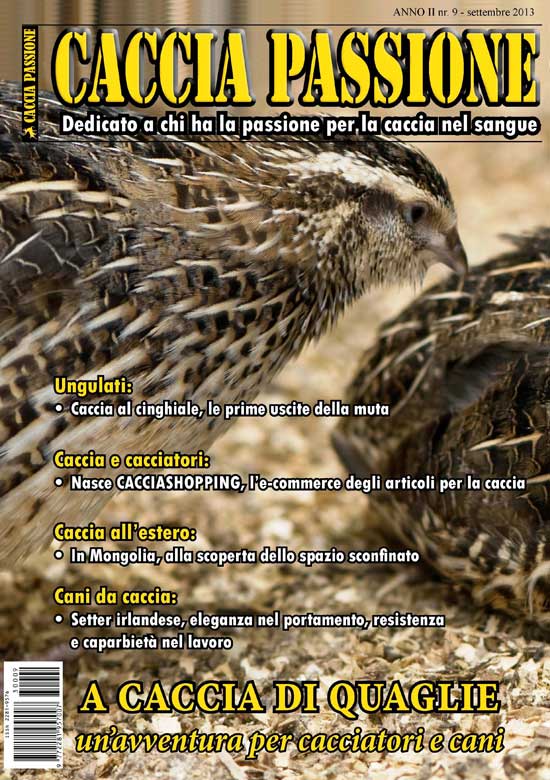 Nel numero di Settembre 2013 abbiamo voluto dare grande spazio alla caccia della Stanziale.. infatti abbiamo realizzato un servizio sulla caccia alla quaglia, selvatico cjhe come ben sappiamo sa esaltare ed mettere a dura prova i nostri fedeli cani da caccia.. Inoltre grande attenzione ai risultati venatori della preapertura alla tortora, detta anche estatino.. ove abbiamo potuto anche testare le nostre nuove armi e prepararci al meglio per la grande apertura..