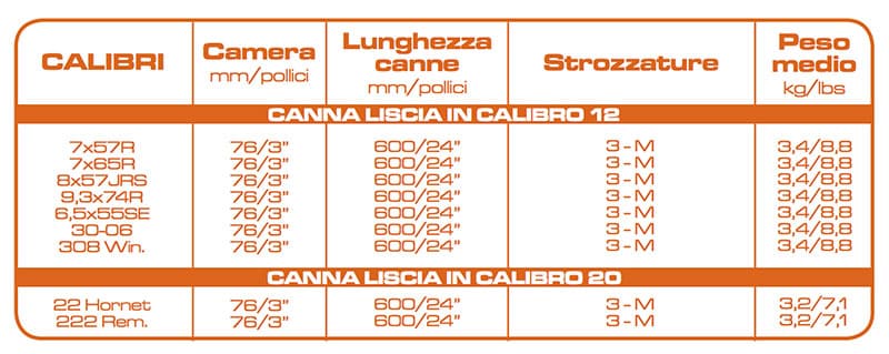 Diamo un accenno ai calibri segnalando l’abbinamento liscio/rigato. Con il liscio in 12/76 si possono avere: 7x57R, 7x65R, 8x57IRS, 9,3x74R, 6,5×55 SE, .30-06 Sprg., .308 Win. mentre con il 20/76 sono proposti il .22 Hornet e il .222 Rem. I pesi sono rispettivamente di 3,4 e 3,2 kg. Da buoni cultori delle cartucce tedesche a collarino per i basculanti osserviamo come la spinta commerciale odierna abbia fatto preferire il 6,5×55 SM al 6,5x57R o al prestante 6,5x65R; nei piccoli calibri, dopo un riverente omaggio al sempre verde .22 Hornet, vedremo bene, magari a fianco del .222 Rem. il validissimo 5,6x50R DWM ampiamente diffuso, o il meno diffuso, ma tosto assai 5,6x57R della RWS. Poi, per tornare con i piedi per terra, provate a pensare quale selvatico delle nostre zone potrebbe sfuggirvi con un 7x65R.