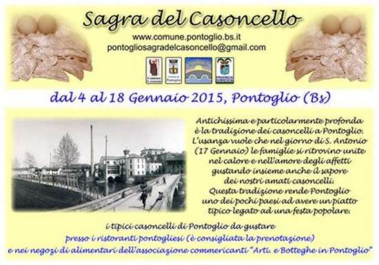 Sagra del Casoncello di Pontoglio e Festa di S.Antonio Programma: Dal 4 al 18 Gennaio 2015 potrete vivere l’antichissima tradizione Pontogliese, che vuole che nei giorni vicini al 17 gennaio (s.Antonio) in tutte le case si cucinino i famosi casoncelli, tradizione che potrete fare vostra acquistandoli, nei negozi di alimentari, o assaporandoli nei ristoranti Pontogliesi. Sabato 17 e Domenica 18 Gennaio ricco programma con giochi dei tempi che furono, luna park, bancarelle, fuochi d’artificio, gare podistiche, caldarroste ecc. ecc..