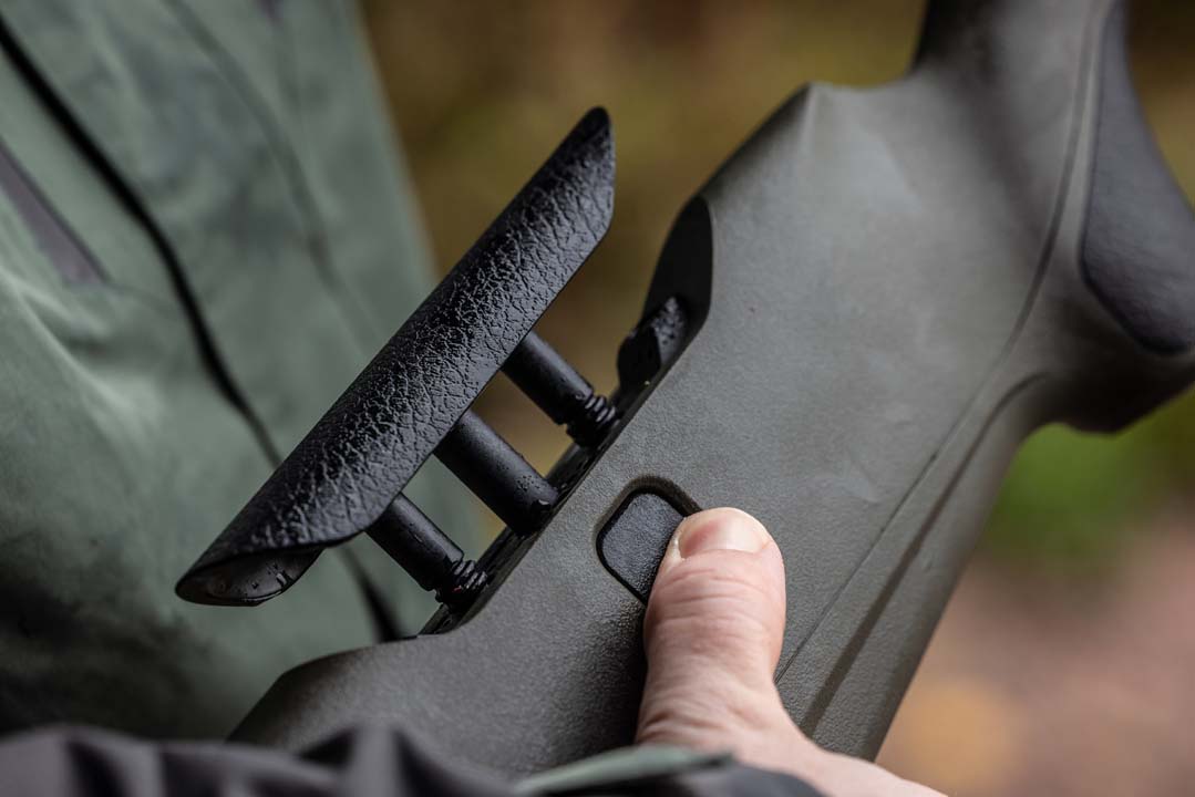 Regolazione del poggiaguancia – Il sistema di regolazione integrato consente di adattare la calciatura alle esigenze del tiratore per un comfort ottimale.