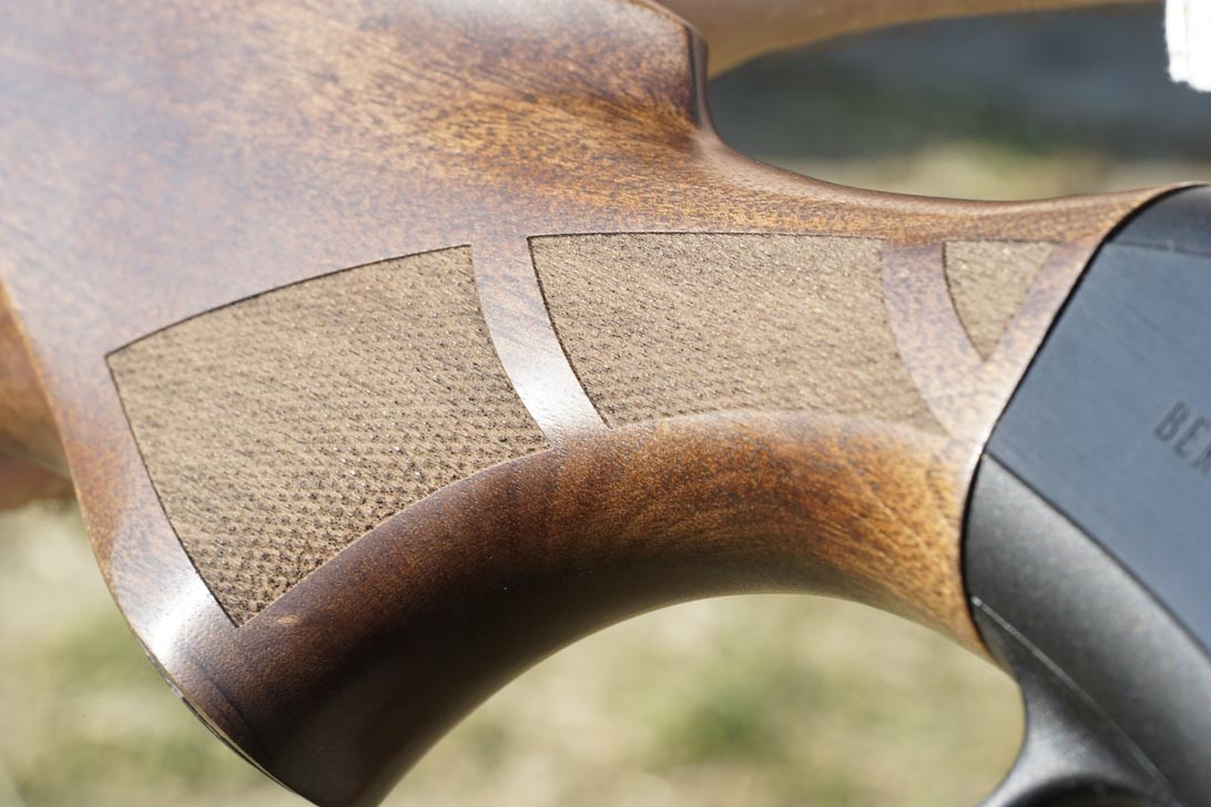 La carcassa è in ergal con ossidazione nera antiriflesso, ed entrambi i fianchi sono arricchiti da sobrie incisioni laser ispirate al mondo venatorio. Sul lato destro, sopra il grilletto, sono visibili il logo Beretta e una beccaccia in volo; proseguendo in avanti, sotto l’apertura del carrello si trovano il logo UltraLite e due fregi curvi; nella zona anteriore della culatta, dopo il bottone di sblocco serbatoio s’invola una seconda beccaccia. Passiamo al lato sinistro, dove oltre al bottone del cut-off sono presenti altre due beccacce in volo, troviamo il logotipo A400 UltraLite e fregi. Il grilletto in acciaio cromato è protetto dalla guardia in polimero nero dove è riportato il logo Xplor, mentre la sicura, con il generoso pulsante triangolare, si trova subito sopra il grilletto stesso. Il calcio e l’asta sono in legno di grado 2, una soluzione che consente un facile ripristino in caso di graffi – evenienza abbastanza comune soprattutto quando si tratta di un fucile nato per la caccia vagante. Il calciolo è il classico MicroCore Beretta da 10 mm che espandendosi all’atto dello sparo aumenta la superficie d’appoggio sulla spalla, conferendo maggiore stabilità e assorbendo gran parte del rinculo: una caratteristica importante, soprattutto per un fucile la cui principale caratteristica è appunto la leggerezza. Sulla pistola del calcio, nella coccia, è inserito un’elegante ovale in fibra di carbonio che riporta il classico 3 frecce Beretta.