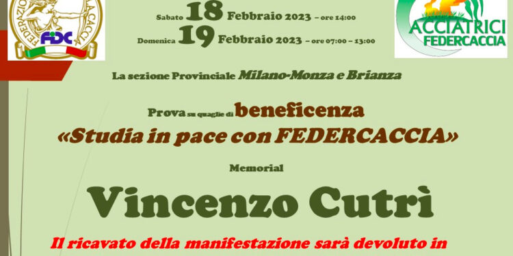 La Federazione Italiana della Caccia e le Cacciatrici Federcaccia, in collaborazione con la Sezione Provinciale FIdC Milano-Monza e Brianza, organizzano per sabato 18 e domenica 19 febbraio, la prova su quaglie di beneficenza “Studia in pace con Federcaccia” Memorial Vincenzo Cutrì. Il ricavato della manifestazione sarà devoluto in beneficenza per l’acquisto di materiale didattico per i ragazzi Ucraini.