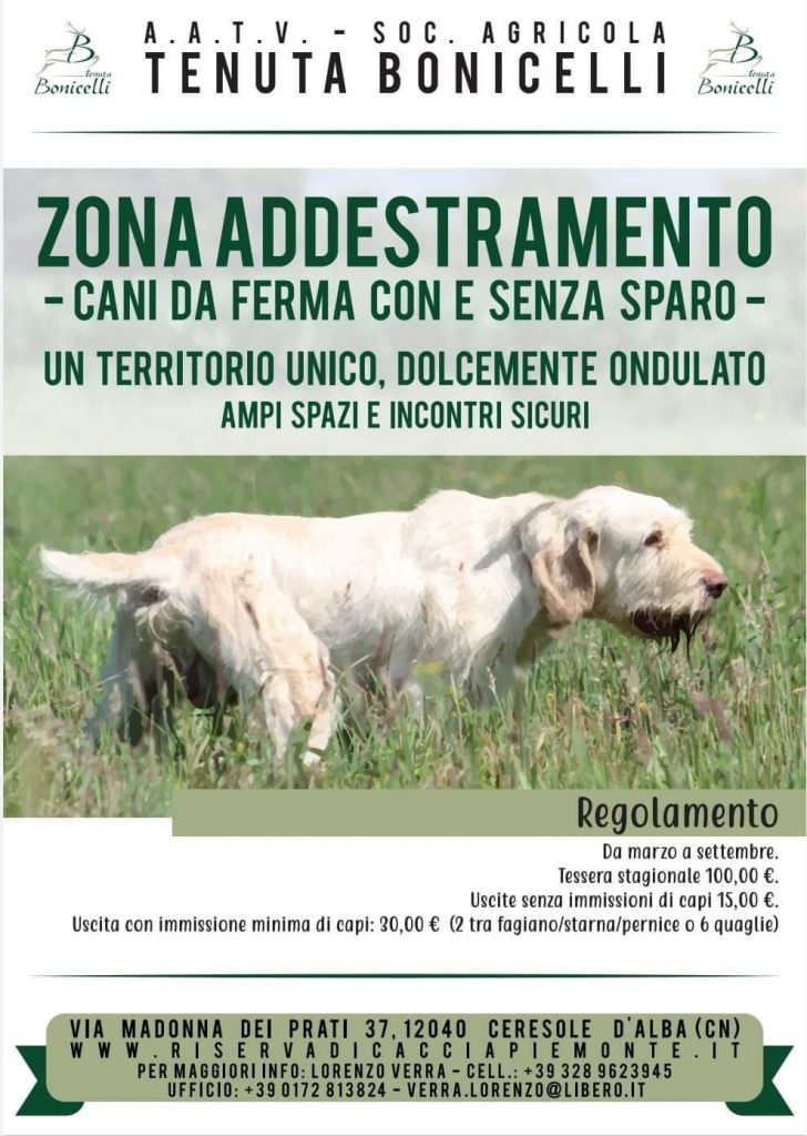 In base a quanto previsto dalle ultime ordinanze, l’attività dovrà essere svolta singolarmente, unitamente ai cani da addestrare, secondo una turnazione di utilizzo delle Zone di addestramento e allenamento cani. Nella Tenuta Bonicelli è presente un territorio unico, dolcemente ondulato con ampi spazi e incontri più che sicuri. Il regolamento della ZAC (con e senza sparo) è presto detto.