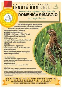 Si sta parlando di una prova su quaglie liberate, con le consuete categorie previste, vale a dire “Inglesi cacciatori”, “inglesi Elite”, “Continentali Cacciatori” e “Continentali Elite”. Sarà possibile pranzare in loco, previa prenotazione: il trofeo verrà assegnato al soggetto col maggior punteggio determinato dalla somma dei punti ottenuti nelle diverse prove del circuito. Per ulteriori informazioni si può contattare Lorenzo Verra al numero 3289623945.