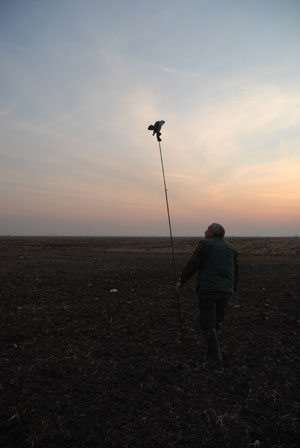 Alle quattro e mezza suona la sveglia, un po’ di tempo per prepararmi e scendo per la prima colazione, trovo già tutti i miei compagni di caccia pronti per la partenza, alle sei già c’è luce. Veniamo distribuiti sui vari mezzi e via ognuno verso la sua destinazione. Vengo lasciato in una zona situata fra un campo lavorato e un incolto, la zona è abbastanza umida, cerco di orientarmi e prendere qualche riferimento. Nel frattempo la mia guida completa il capanno di rete mimetica con qualche ramo, posiziona lo sgabello, sarebbe faticosissimo rimanere in piedi tutte quelle ore. Poi passa alla parte richiami, prima monta l’asta per la civetta, un palo di circa tre metri alla cui sommità è posizionata una civetta di plastica dalle ali rotanti, dopo è la volta della giostra con le sue allodoline imbalsamate ad ali aperte, che girando fungono da richiamo, non può mancare il “macaco” e gli specchietti, che riflettendo la luce del sole diventano un attrazione irresistibile per il piccolo migratore.